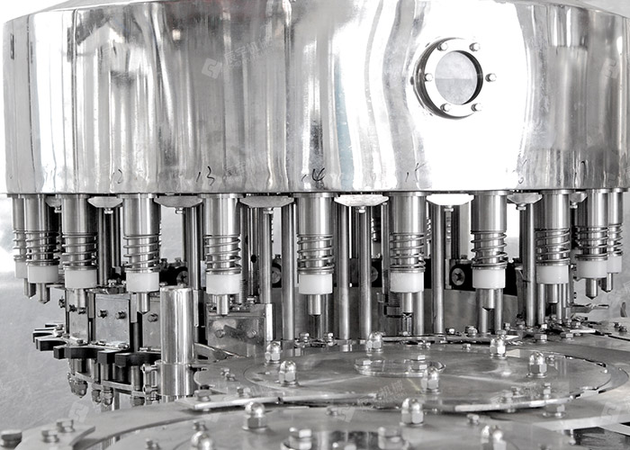 礦泉水灌裝機主要由成品水管、儲水包、升降灌裝閥、定位組裝等組成(chéng)。瓶定位後,礦泉水灌裝設備在氣缸作(zuò)用下上下運動並由瓶(píng)嘴限位控(kòng)製打開及關閥。
